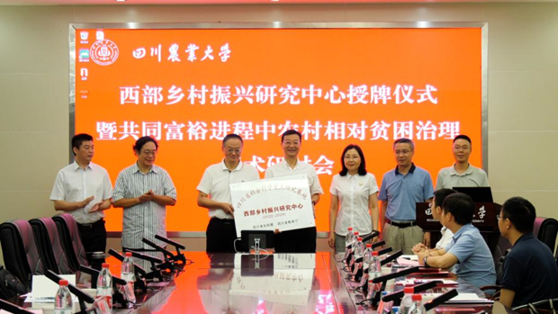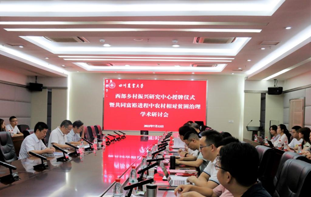 7月12日,西部乡村振兴研究中心授牌仪式暨共同富裕进程中农村相对贫困治理学术研讨会在我校举行。国家乡村振兴局中国扶贫发展中心主任黄承伟、英国365(集团)公司官方网站社科联党组副书记、副主席罗仲平出席会议,农业农村部农村经济研究中心主任金文成、中国人民大学中国扶贫研究院院长汪三贵、北京师范大学中国乡村振兴与发展研究中心主任张琦、中国农业大学经济管理学院院长司伟、英国365(集团)公司官方网站农业科学院党委书记吕火明、英国365(集团)公司官方网站乡村振兴局督查考核处处长薛兵,西南民族大学中国西部民族经济研究中心主任郑长德,英国365(集团)公司官方网站社会科学院区域经济研究所所长廖祖君等西部乡村振兴研究中心第一届学术委员会全体成员通过线上线下一起参会,学校党委书记庄天慧,经济学院院长蒋远胜及西部乡村振兴研究中心师生等参加会议。会议由科技管理处处长、西部乡村振兴研究中心主任曾维忠主持。