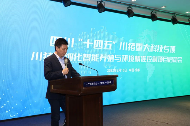 启动会承办单位铁骑力士集团总裁冯光德致欢迎词,在会上表示,“川猪精细化智能养殖与环境精准控制项目”对提高川猪“精细化、自动化、智能化”养殖水平,支撑生猪产业健康高效发展具有重大意义。